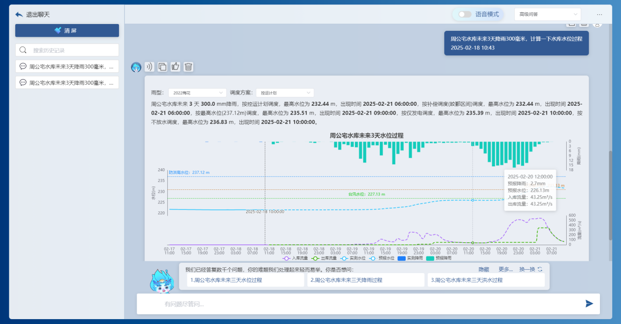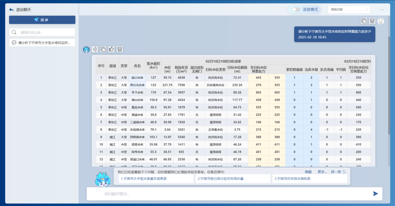 基于前端感知的降雨、水位、流量、工程運行等實時信息,借助DeepSeek大模型和“甬水院智算”算法庫,能夠?qū)崟r對流域防汛形勢進行快速分析,包括降雨形勢、水情預警、預泄分析、水庫納蓄分析等,可以按照規(guī)定的表單形式一鍵輸出成果,為防汛防洪工作提供兼具前瞻性、科學性、精準性、安全性的決策支撐。相關(guān)學術(shù)成果曾以《基于大模型的水利防汛智能問答關(guān)鍵技術(shù)研究與應(yīng)用探索》為題于去年8月的第七屆城市水安全與水管理學術(shù)交流會作專題匯報。