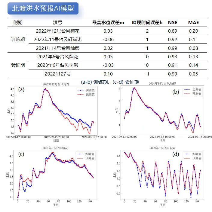利用成熟水利專業(yè)模型模擬計算不同降雨潮位邊界條件下的洪水過程數(shù)據(jù),再基于DeepSeek對海量洪水模擬數(shù)據(jù)成果進行模型訓練和蒸餾。目前我院已對北渡、鎮(zhèn)海等重要流域控制站點進行了AI洪水預報模型訓練和精度驗證,結(jié)果表明AI洪水預報的準確性不輸傳統(tǒng)水利專業(yè)模型。