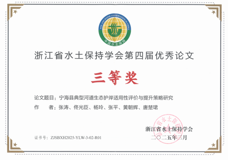 會(huì)議現(xiàn)場通報(bào)了2024年度生產(chǎn)建設(shè)項(xiàng)目水土保持方案優(yōu)秀單位、2024年度生產(chǎn)建設(shè)項(xiàng)目水土保持監(jiān)測(cè)優(yōu)秀單位,并為獲獎(jiǎng)集體進(jìn)行表彰。隨后,又現(xiàn)場表彰了浙江省水土保持學(xué)會(huì)第四屆優(yōu)秀論文評(píng)選結(jié)果。我院榮獲2024年度生產(chǎn)建設(shè)項(xiàng)目水土保持方案優(yōu)秀單位、2024年度生產(chǎn)建設(shè)項(xiàng)目水土保持監(jiān)測(cè)優(yōu)秀單位兩項(xiàng)集體榮譽(yù),并且以論文《寧??h典型河道生態(tài)護(hù)岸適用性評(píng)價(jià)與提升策略研究》獲得浙江省水土保持學(xué)會(huì)第四屆優(yōu)秀論文三等獎(jiǎng)。