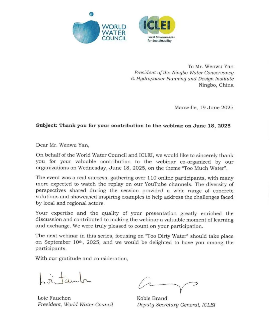 研討會(huì)圓滿落幕后,世界水理事會(huì)特向嚴(yán)文武院長(zhǎng)發(fā)來(lái)感謝信,并盛情邀請(qǐng)其參加下一屆研討會(huì)。