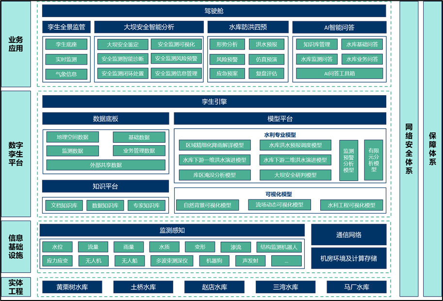 《方案》以黃栗樹等五座水庫為核心對象,進(jìn)行了前瞻性的信息化總體設(shè)計。旨在通過引入先進(jìn)信息技術(shù),構(gòu)建覆蓋水庫運行管理全生命周期的智能化體系。該體系以實現(xiàn)對水雨情、工情、供用水、水質(zhì)及安全狀況等關(guān)鍵要素的精準(zhǔn)感知、動態(tài)監(jiān)測、智能分析與高效決策為核心目標(biāo),全面提升水庫在科學(xué)調(diào)度、風(fēng)險防控、管理效能與服務(wù)保障方面的綜合能力。主要建設(shè)內(nèi)容涵蓋智慧業(yè)務(wù)應(yīng)用、數(shù)字孿生平臺、信息基礎(chǔ)設(shè)施及網(wǎng)絡(luò)安全體系,共同構(gòu)成層次清晰、協(xié)同聯(lián)動、安全可靠的現(xiàn)代化水利信息化總體框架,為區(qū)域水安全與可持續(xù)發(fā)展奠定堅實的數(shù)字基石。