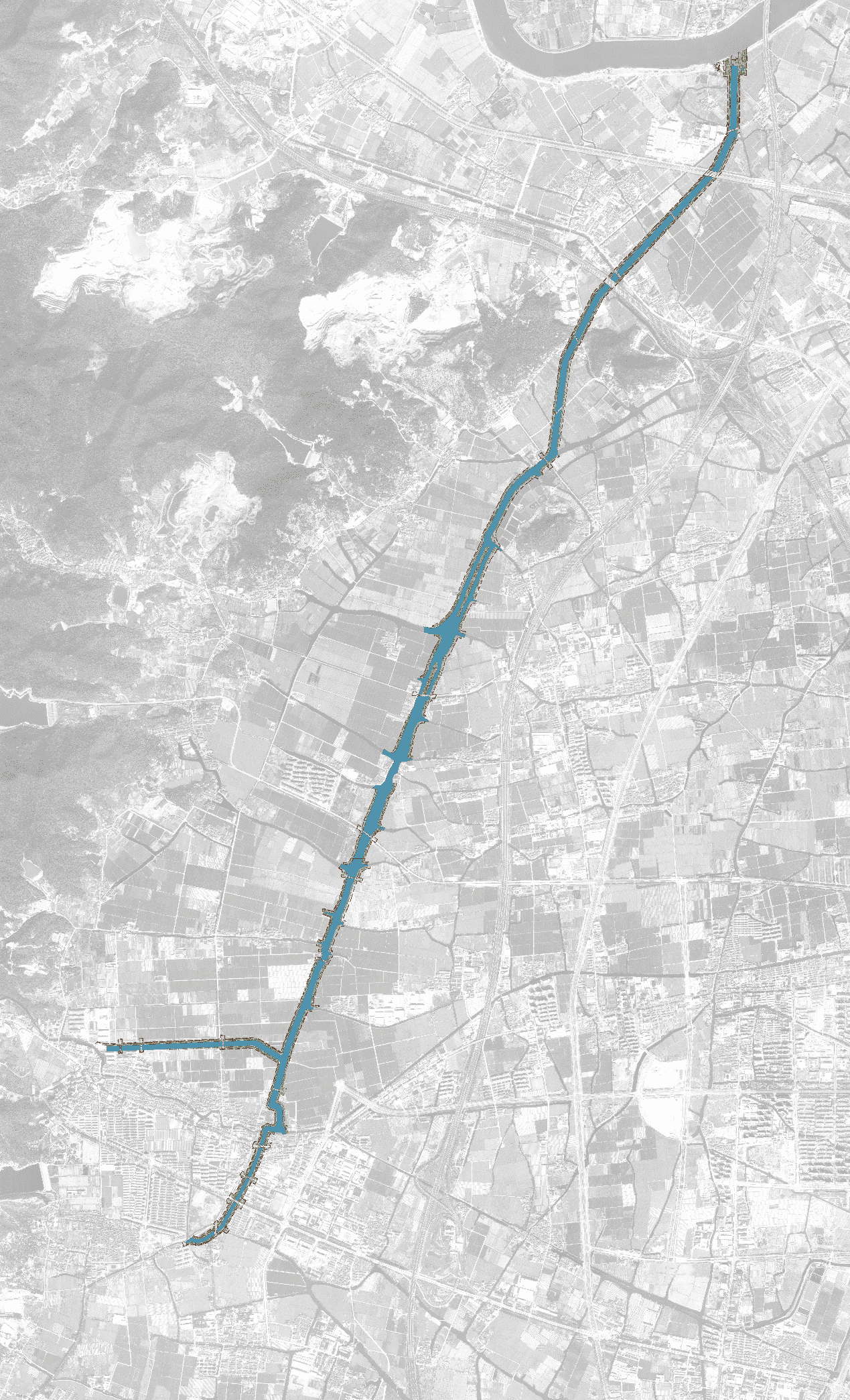本工程的測(cè)繪工作完成E級(jí)GPS控制點(diǎn)40個(gè),四等水準(zhǔn)測(cè)量約30公里;1:500地形測(cè)量約3.123平方公里,其中,陸域地形約2.827平方公里,水域地形約0.296平方公里;1:200橫斷面測(cè)量約33.6公里,1:500縱斷面測(cè)量約29.6公里,特征高程點(diǎn)500個(gè)。