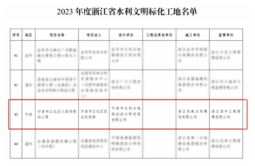 近日,經(jīng)浙江省水利廳2023年度浙江省水利文明標(biāo)化工地名單公布,我院承擔(dān)全過(guò)程工程咨詢(xún)的寧波市江北區(qū)小西壩泵站工程喜獲“浙江省文明標(biāo)化工地”稱(chēng)號(hào),成為寧波市水利行業(yè)的標(biāo)桿工程。